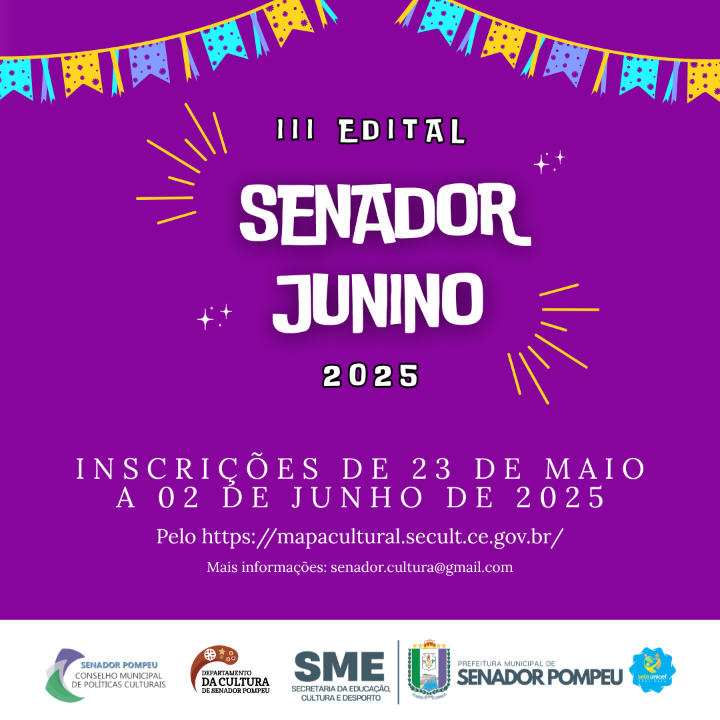 A Secretaria de Educação, Cultura e Desporto de Senador Pompeu, com fundamento na Lei Municipal Nº 1.585/2020, de 07 de julho de 2020, que dispõe sobre a criação do Fundo Municipal da Cultura, com aprovação na 14ª Reunião do Conselho Municipal de Políticas Culturais de Senador Pompeu-CMPC, torna público o processo de inscrição e seleção pública que regulamenta o III Edital Senador Junino 2025.