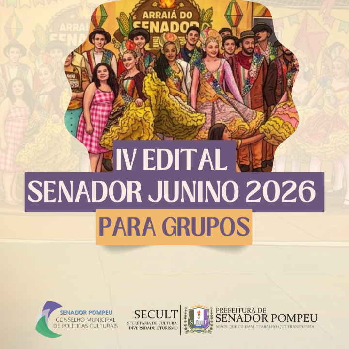 A Secretaria de Cultura, Diversidade e Turismo de Senador Pompeu, com fundamento na Lei Municipal Nº 1.585/2020, de 07 de julho de 2020, que dispõe sobre a criação do Fundo Municipal da Cultura, na Lei Federal nº 13.019, de 31 de Julho de 2014 (MROSC), na Lei Federal nº 14.903/2024 (Marco regulatório de Fomento à Cultura), e no Decreto nº 11.453/2023 (Decreto de Fomento), com aprovação na 19ª Reunião do Conselho Municipal de Políticas Culturais de Senador Pompeu-CMPC, torna público o processo de inscrição e seleção pública que regulamenta o IV Edital Senador Junino 2026.